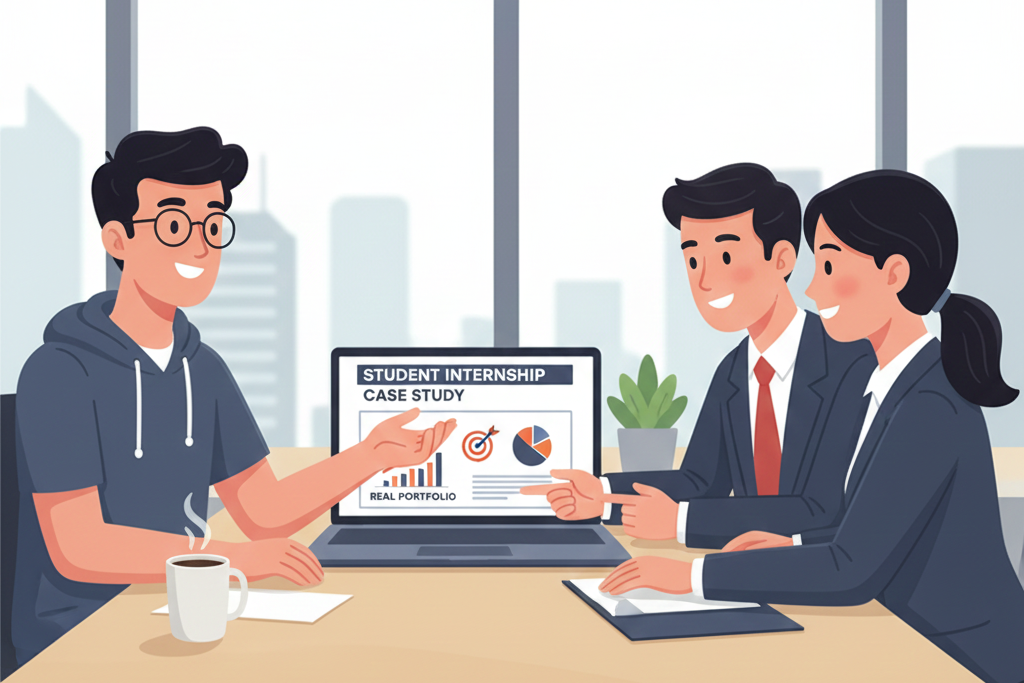 4. Buat dalam Bentuk Case Study: Ubah setiap tugas magang menjadi case study simple dalam format: Judul Proyek – Masalah – Solusi – Hasil. Buat Portofolio ini dalam bentuk website simple yang memicu Cuan instan.
